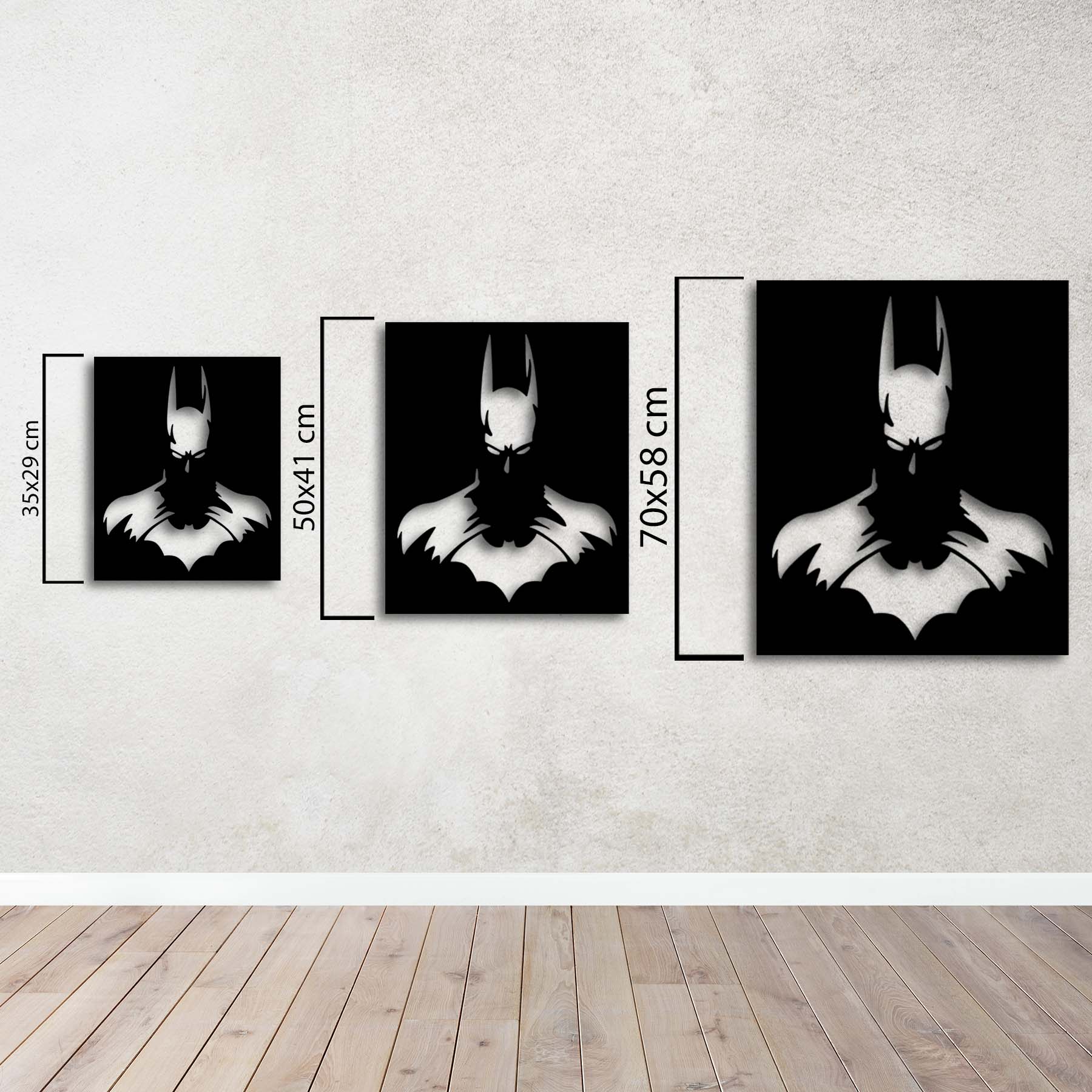 This Batman Metal Wall Art, with its iconic silhouette of the iconic character, a symbol of mystery and protection, is ready to powerfully transform any space. Detailed with laser-cut technology, this artwork is finished with a black electrostatic powder coat for durability and wear resistance, while also providing excellent protection against all weather conditions. Adding a modern touch to personal spaces like your home or office, this piece also brings the courageous and resolute spirit of Gotham's protector into your home. Whether as a gift or for your own collection, this piece of art is the perfect way to add elegance and character to your space.