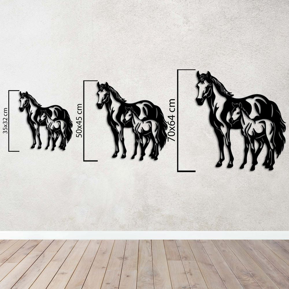 Bring the pure love and connection of nature into your living space! This metal painting, with its elegant depiction of a mother horse and her foal, will add warmth and elegance to your home. It's the perfect decorative piece for your modern living spaces. Crafted from 2mm-thick laser-cut metal and finished with electrostatic powder paint for longevity and durability. Its striking silhouette blends perfectly with both classic and modern decor styles. An ideal choice for creating an atmosphere of love and loyalty!