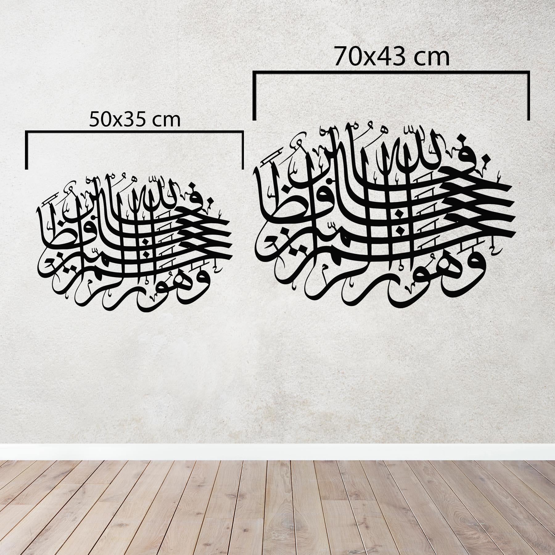 "Surah Yusuf 12:64 – Metal Wall Decor," a calligraphic rendering of verse 12:64 of the Quran, Yusuf, offers a spiritual atmosphere with its profound meaning. This verse contains the Prophet Jacob's statement, "Allah is the best protector, and He is the most merciful of the merciful," expressing his trust in Him.