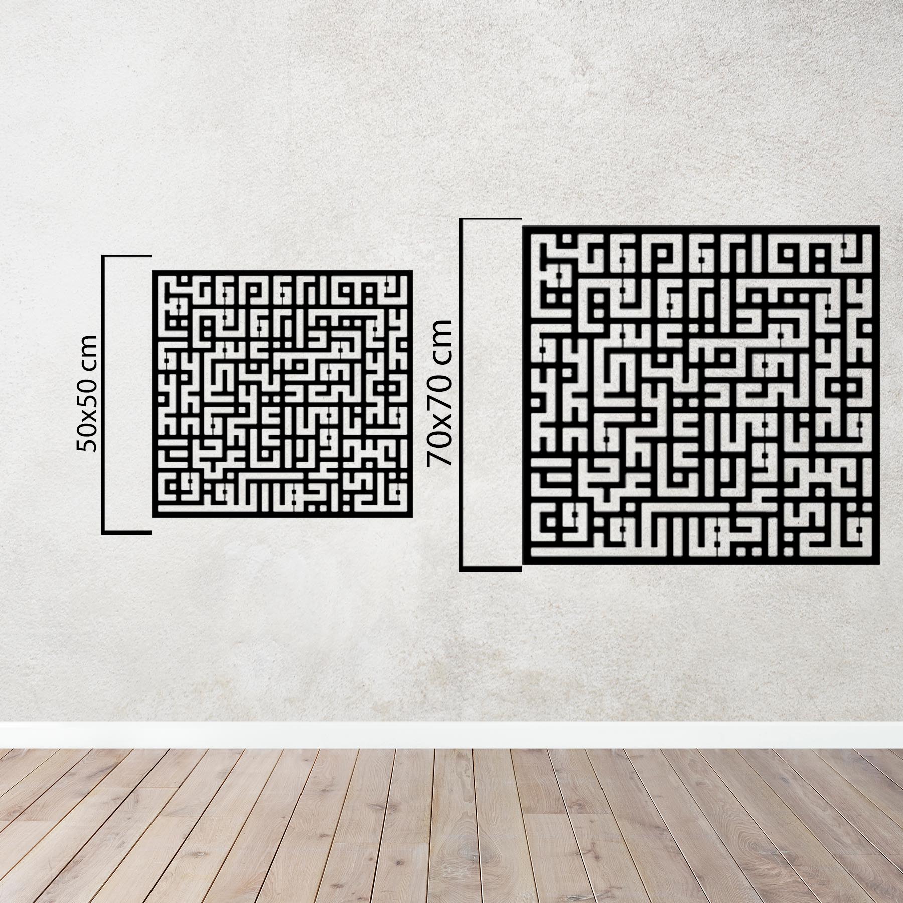 Kufic script, one of the most distinctive calligraphy styles in Islamic art, is combined with the Kafirun Sura in this special metal wall decoration. This Sura, which emphasizes clarity and submission in faith, is rendered with a modern design approach, creating a spiritual atmosphere.