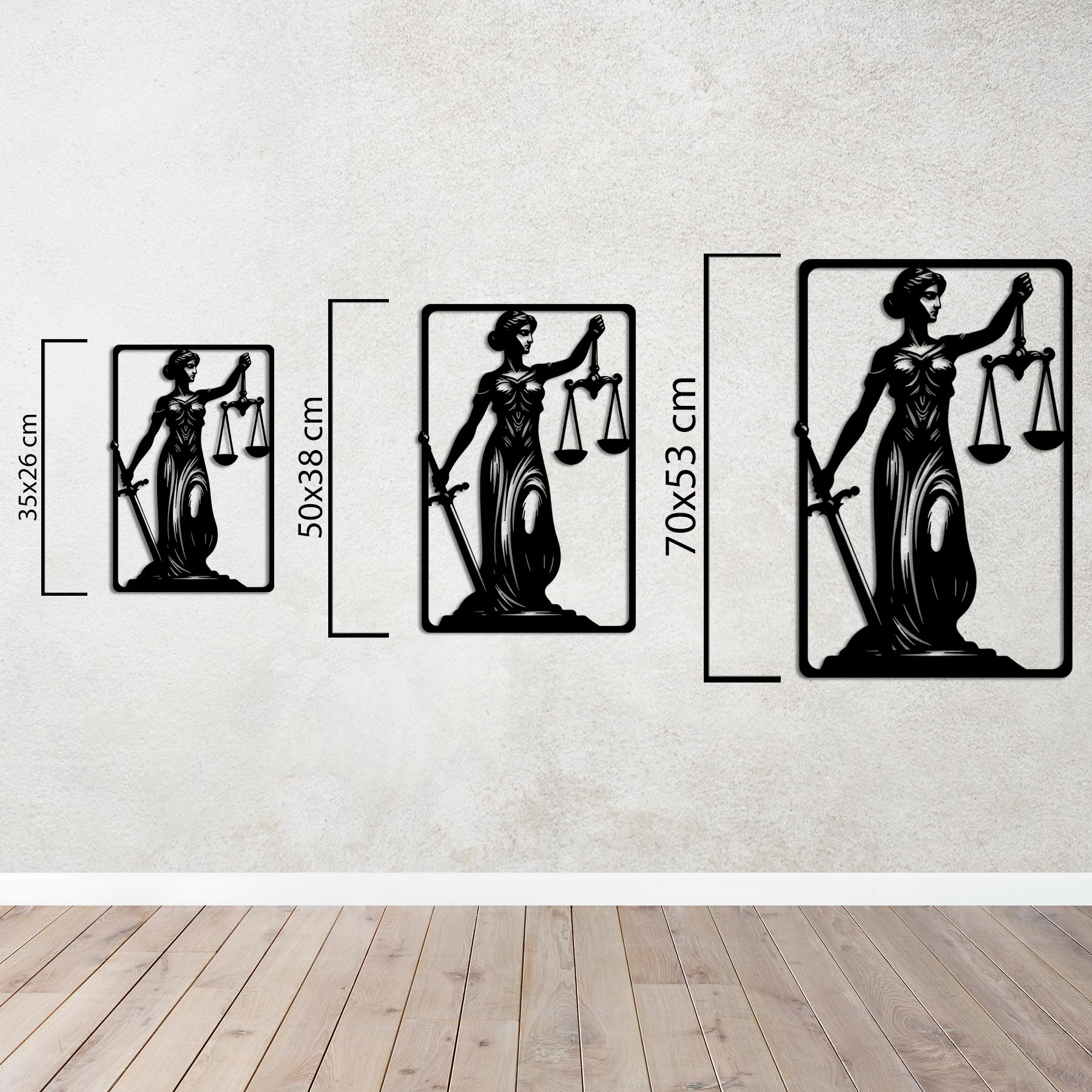 The "Sword of Justice" metal wall decor adds not only elegance but also meaning to your office, law firm, or workspace. The figure with closed eyes represents impartiality, while the scales in one hand represent justice and the sword in the other emphasize the power of law.