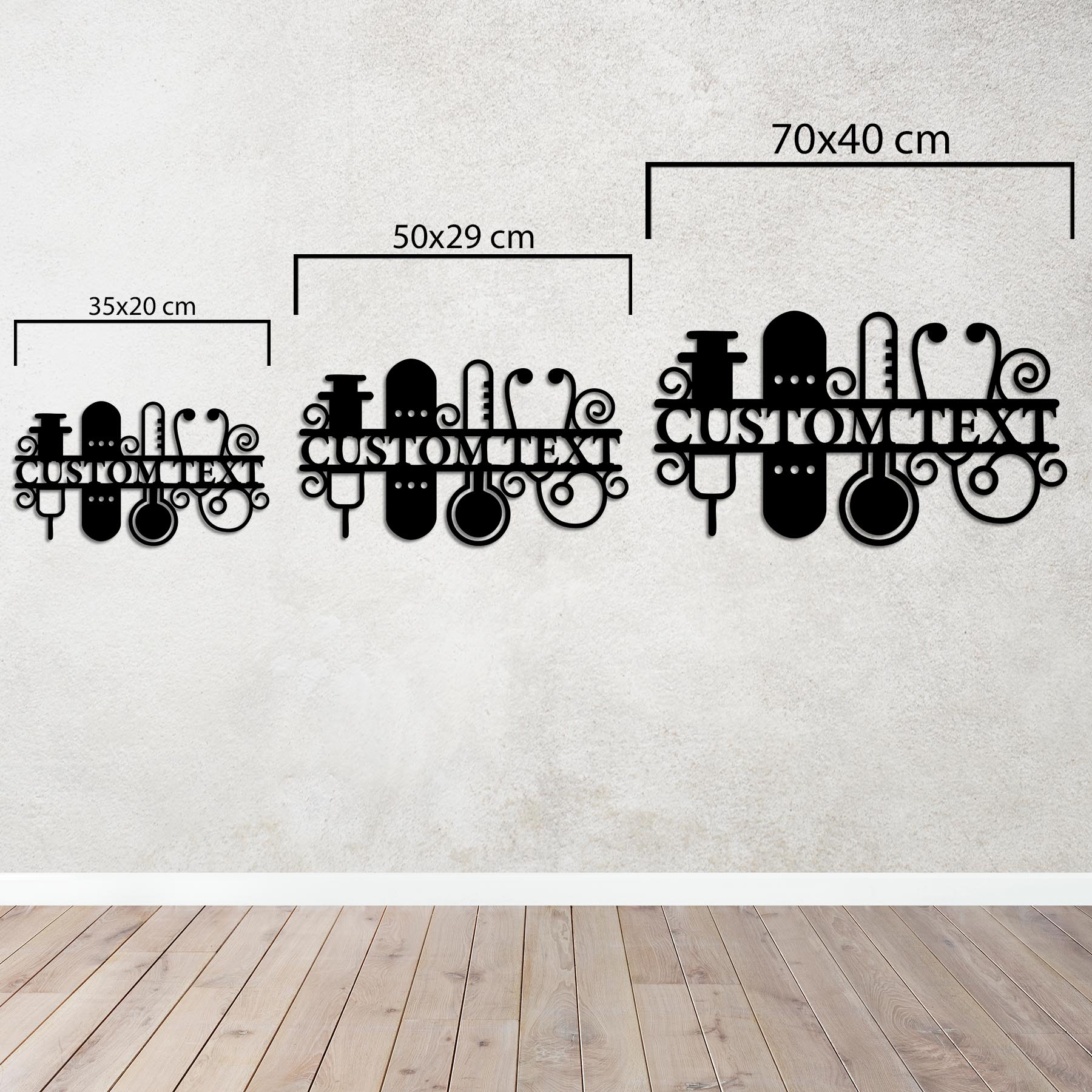 This special wall decor, featuring medical symbols such as a stethoscope, syringe, thermometer, and bandage in an artistic composition, was designed specifically for healthcare professionals. The "CUSTOM TEXT" section at the center allows you to incorporate your name, clinic name, or a special message into this artwork.